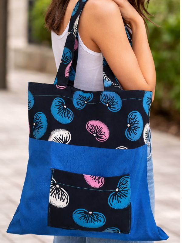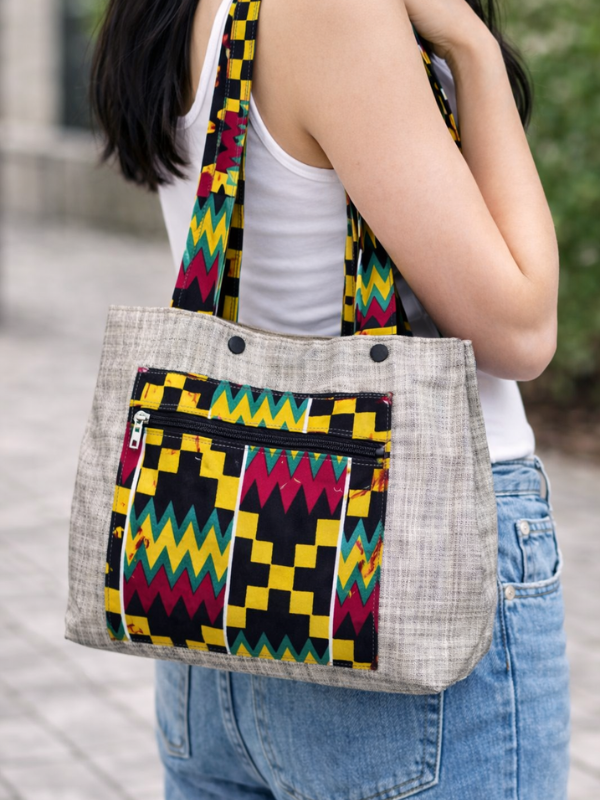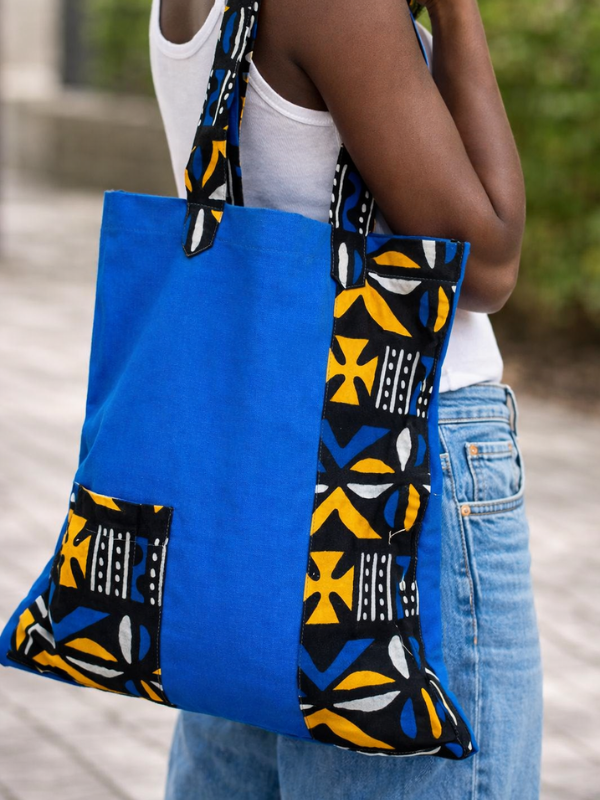 Confectionnés en pagne africain à Kinshasa par une maman d'enfant, chaque modèle de tote bag est unique et chargé de sens.